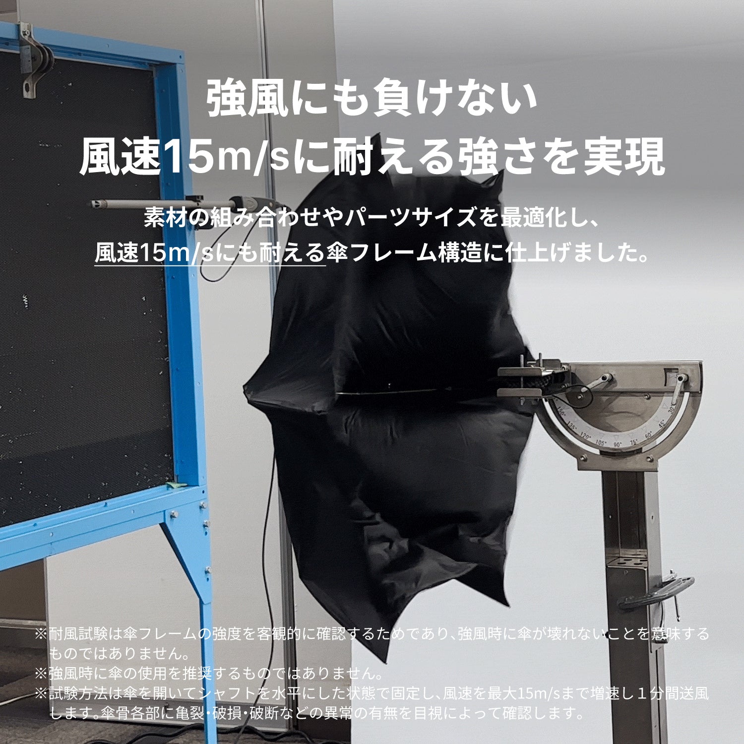 表示の耐風数値は試験設備内での計測値であり、いかなる強風にも耐えられることを保証するものではありません。