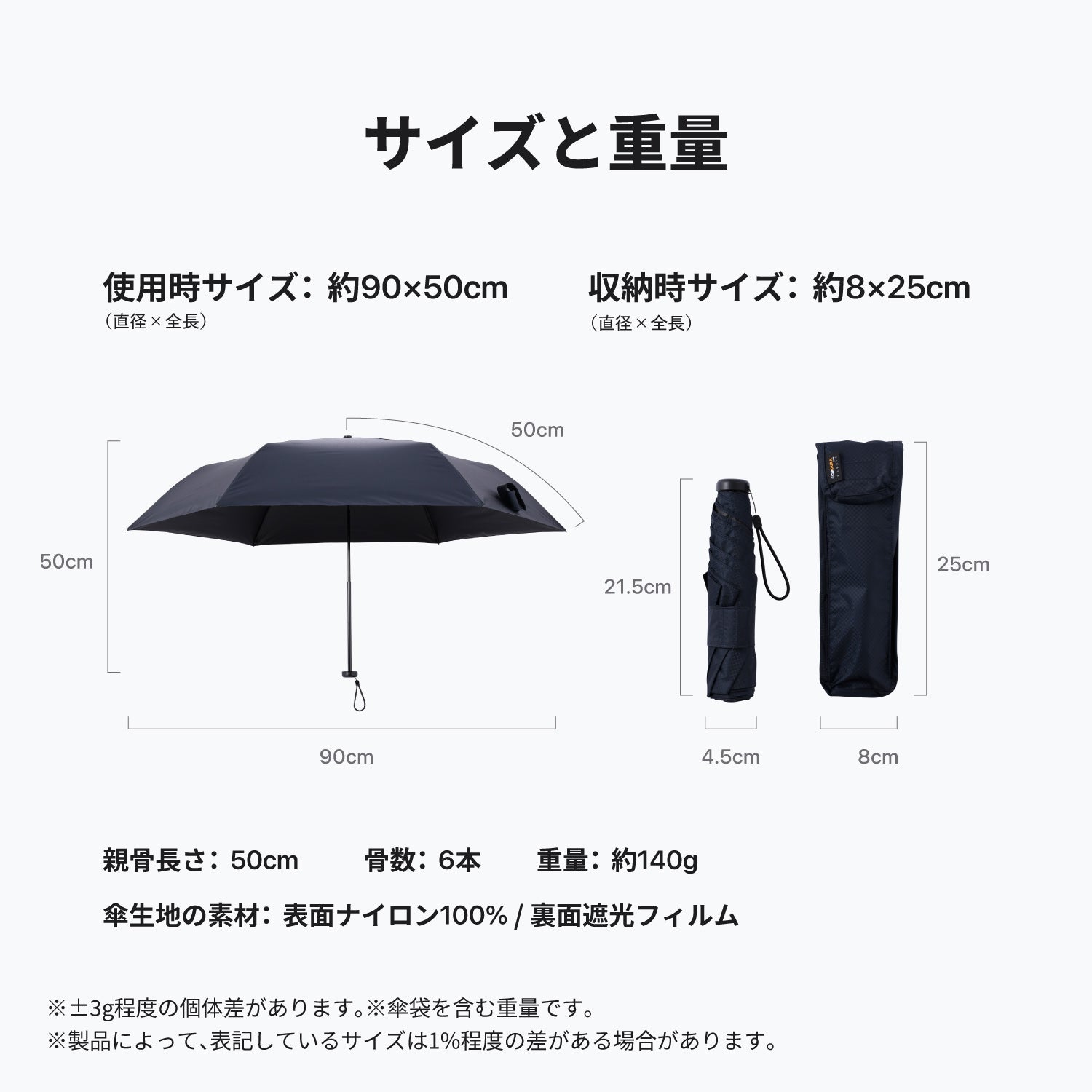 A. 重さは約130gと非常に軽量で、収納時はスリムな携帯用サイズです。広げた時の直径は約90cm(親骨50cm)となっており、雨傘としてはやや小さめなサイズ感ですが、日傘としては十分な大きさを確保しています。常にバッグに忍ばせておく常備傘として最適です。