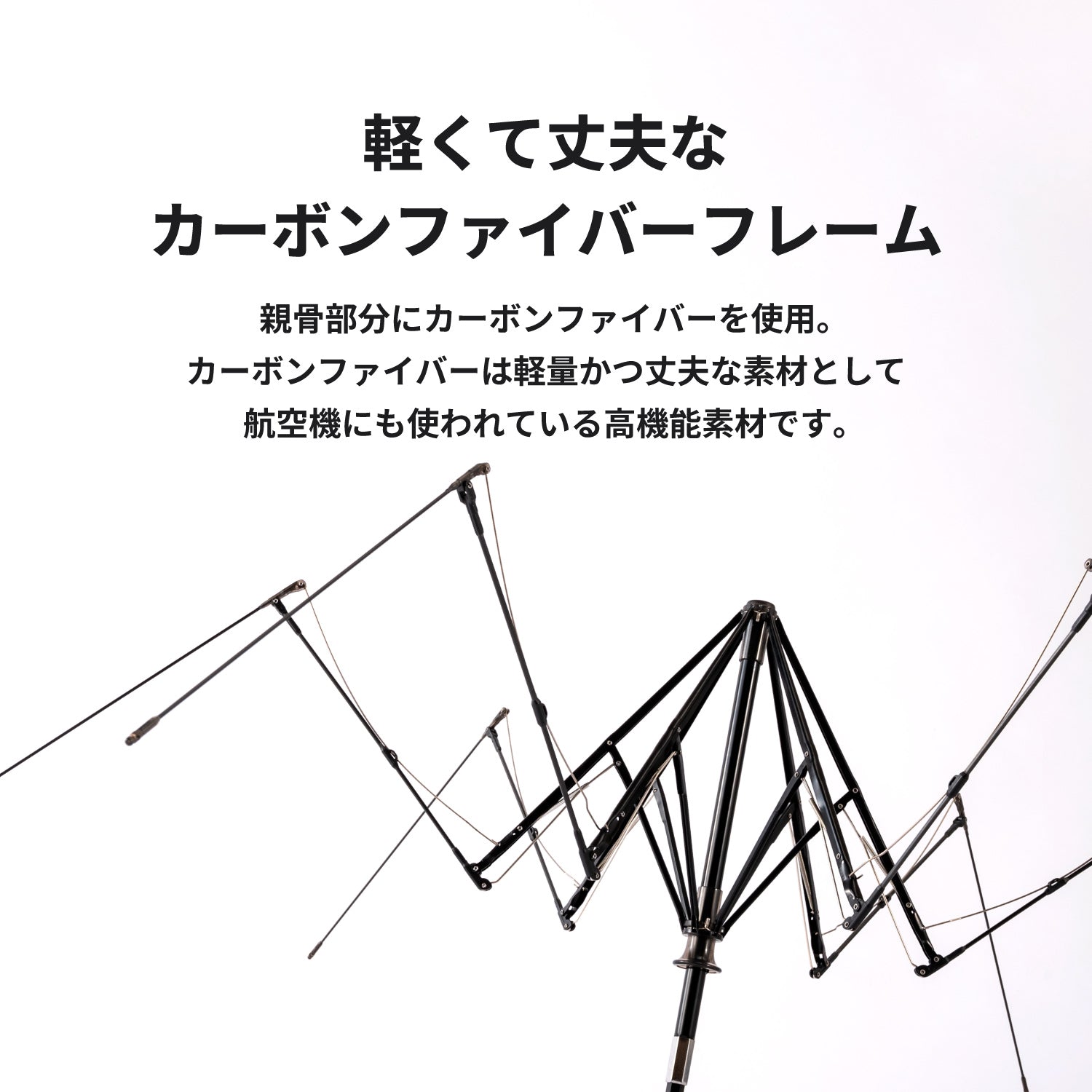 • 荷物を守る「直径107cm」の大判サイズと自動開閉の利便性 直径約107cmのワイド設計により、背負ったリュックや荷物もしっかりとガードします。フレームにはカーボンファイバーを採用し、大判かつ自動開閉でありながら軽快な使い心地を追求しました。