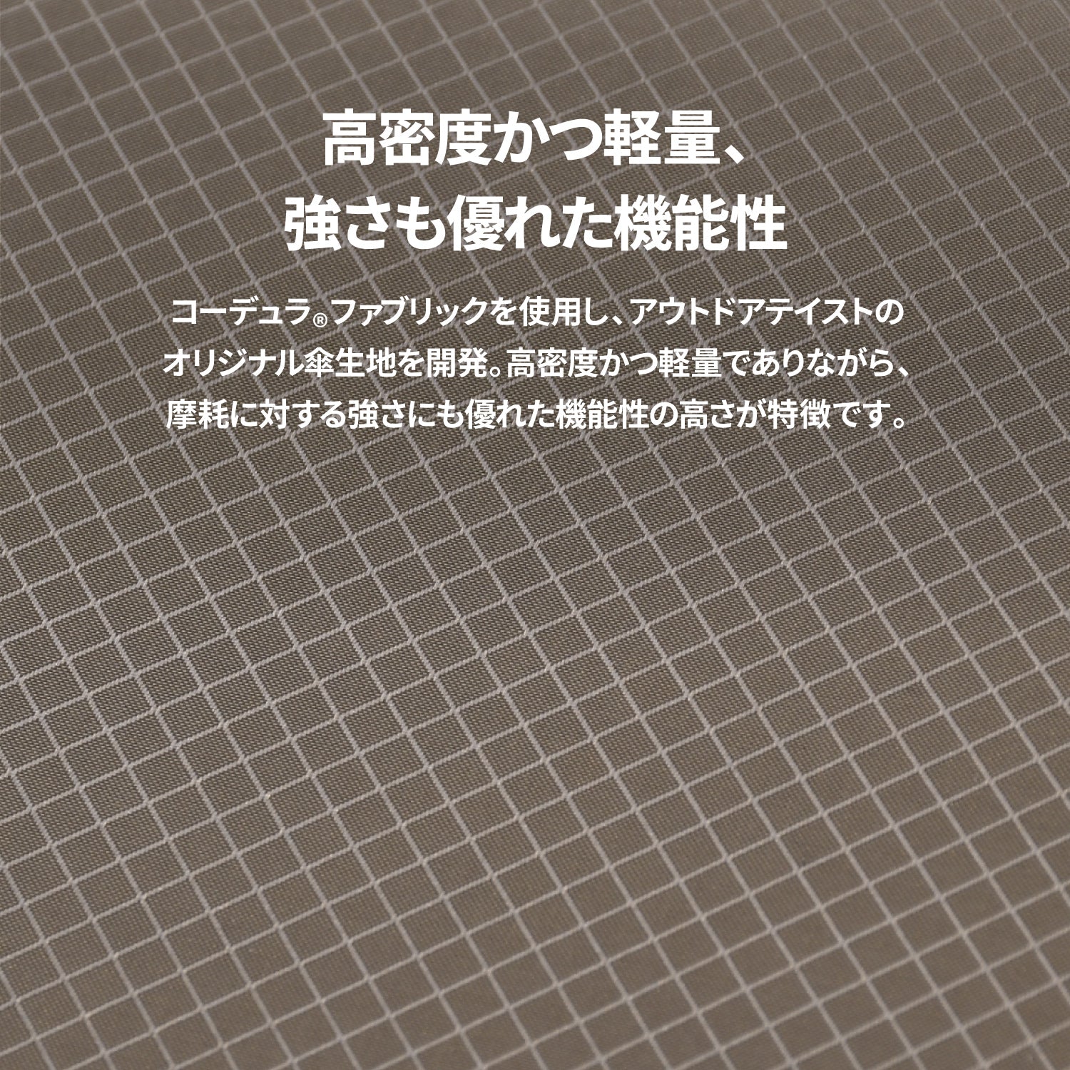 A. 一般的な傘生地よりもはるかに高い耐摩耗性と引き裂き強度を誇ります。アウトドアシーンや毎日のハードな使用でも生地が傷みにくく、お気に入りの一本を長く愛用できる耐久性を備えているのが最大の特徴です。