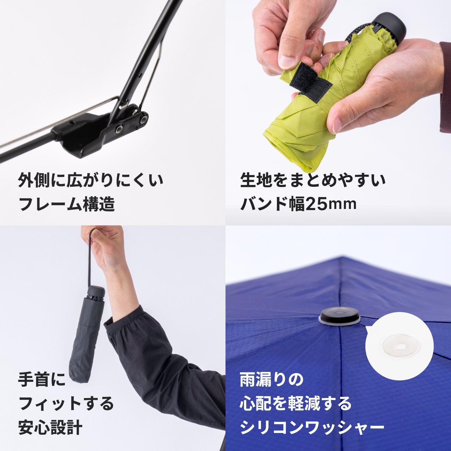 The comfort of using the umbrella continues even after it's closed. We applied an "Easy-Dry" treatment, which infuses nano-level particles into the fabric. With a single shake, water droplets roll off, minimizing the stress of wetting your bag. We also adopted a 25mm wide band to reduce the hassle of folding. Furthermore, in consideration of both user and environmental friendliness, we use safe OEKO-TEX®-certified fabrics and select water-repellent agents that do not contain PFOA, which is harmful to the human body. We believe that meticulous attention to detail leads to trust from our users.
